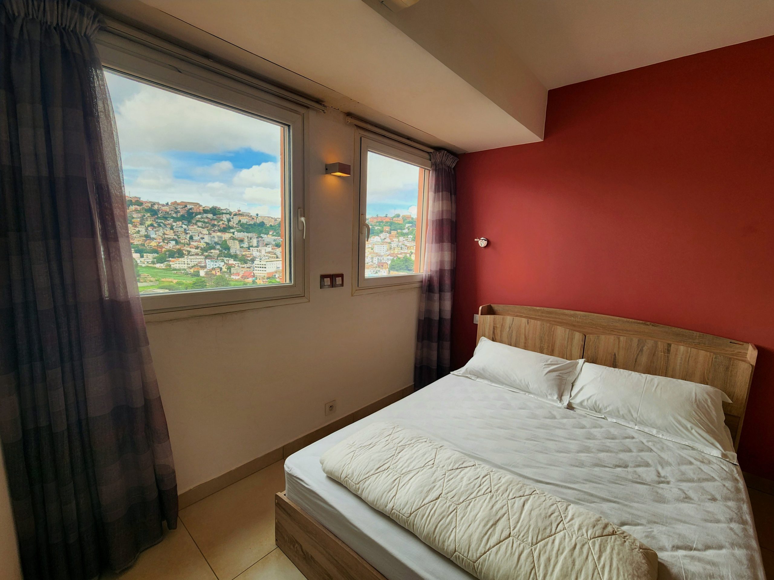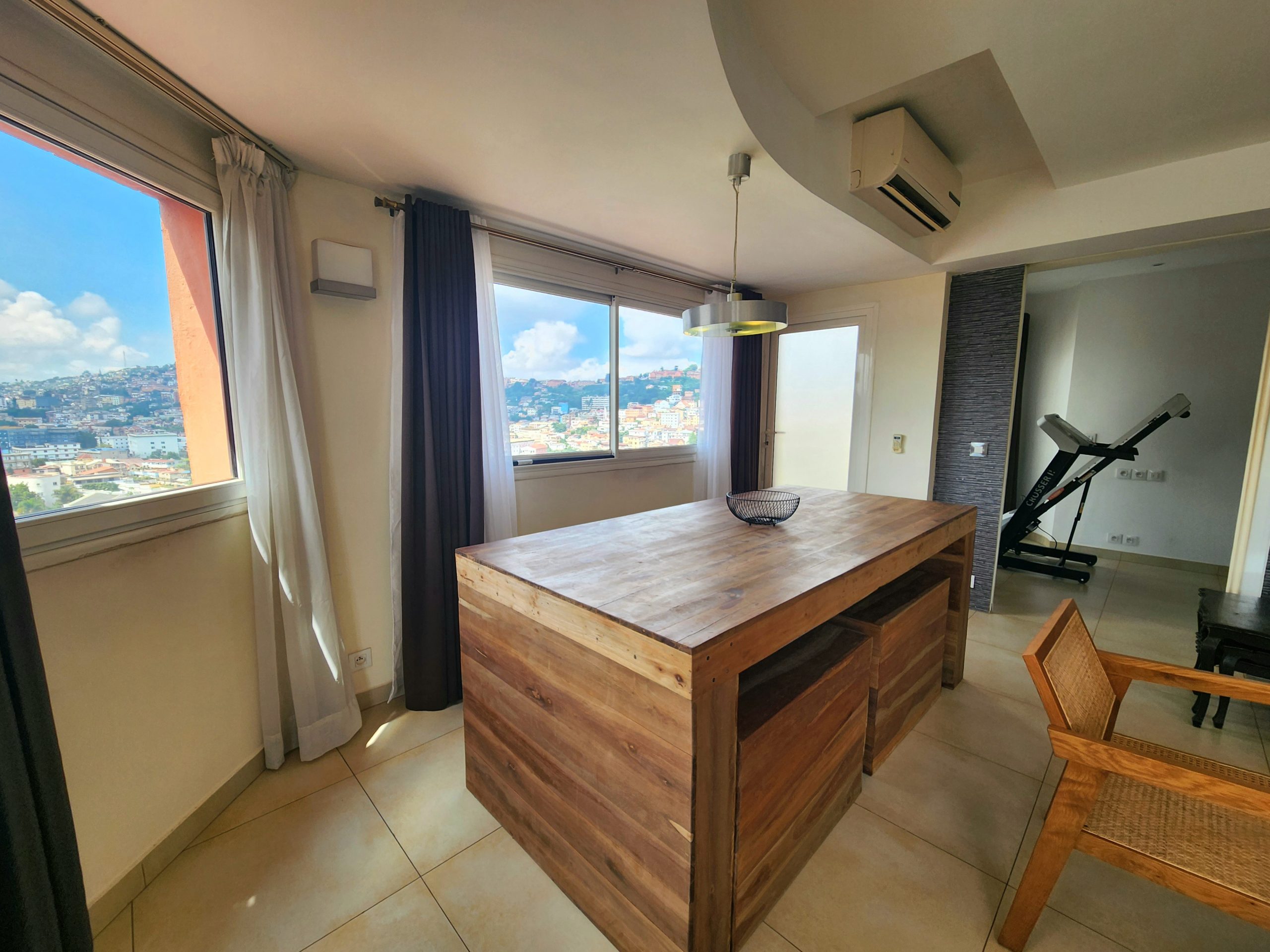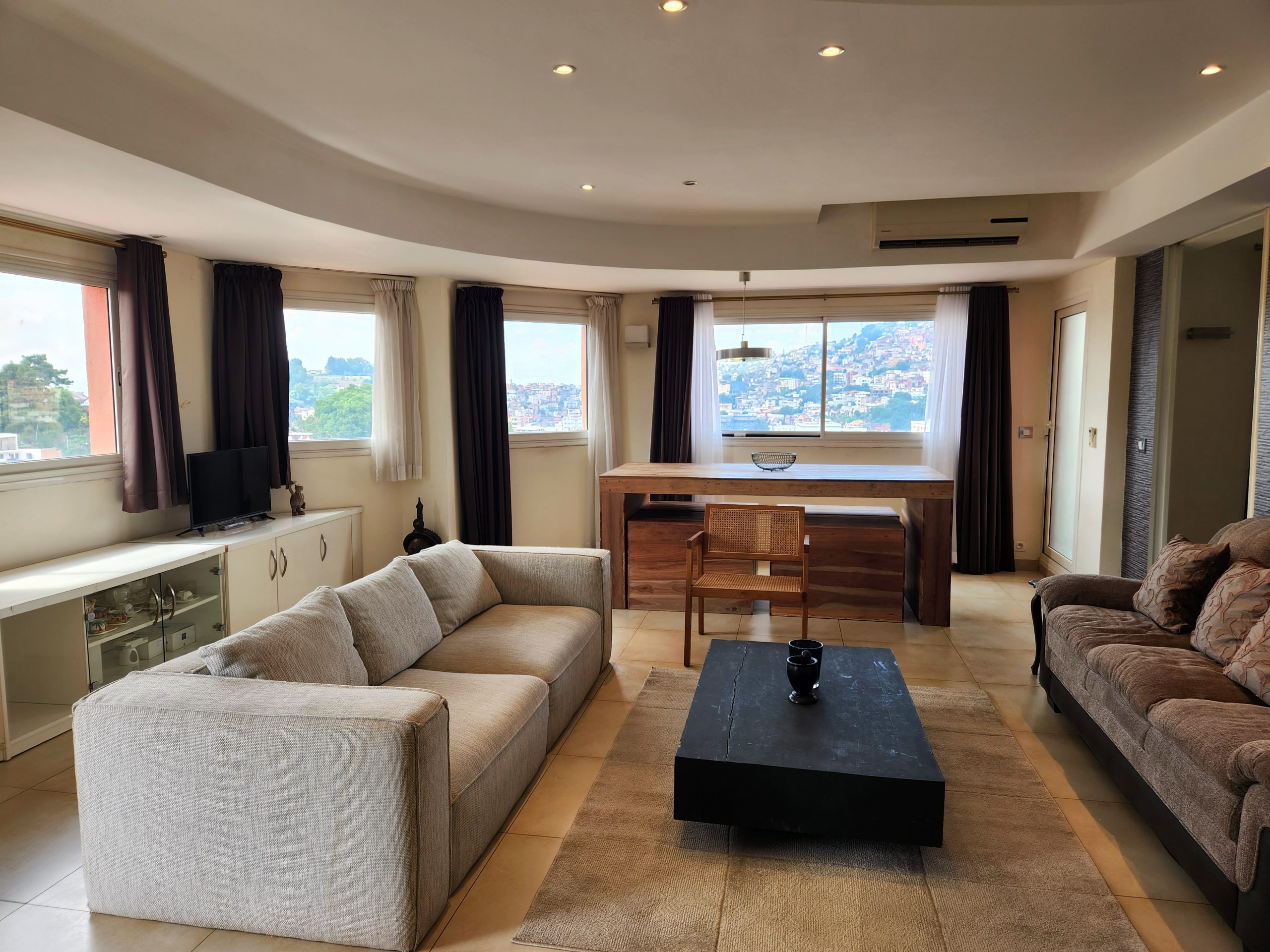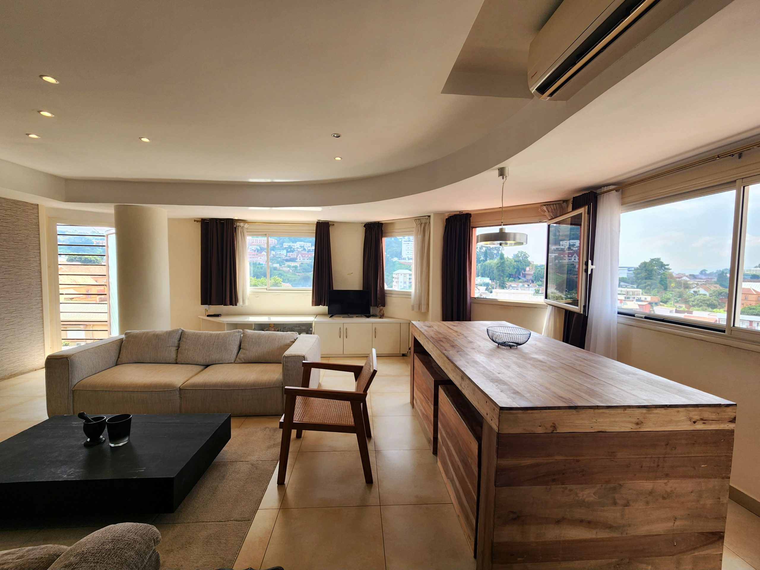 Très bel appartement, climatisé, lumineux, entièrement meublé et équipé, sis au 4ème étage, avec ascenseur, d’une résidence sécurisée 24h/24, dans le quartier résidentiel d’Ampahibe, offrant une vue imprenable sur les collines de la Haute-Ville, sans vis-à-vis, dont voici les détails: