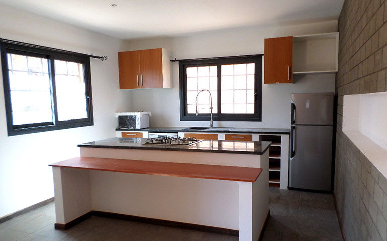 • cuisine américaine, équipée de cuisinière à gaz quatre feux, réfrigérateur, micro-ondes, lave-vaisselle et four, ouverte sur le salon et la terrasse